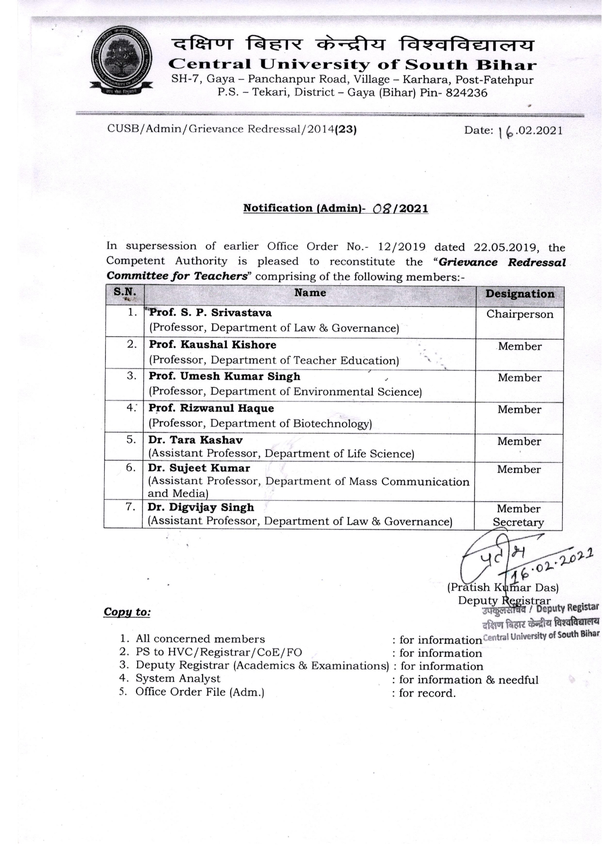 • He will take decisions on grievances which are pending for more than three months. Aggrieved parties who are not satisfied with redressal in subordinate/attached formation can approach the Vice-Chancellor for a decision.