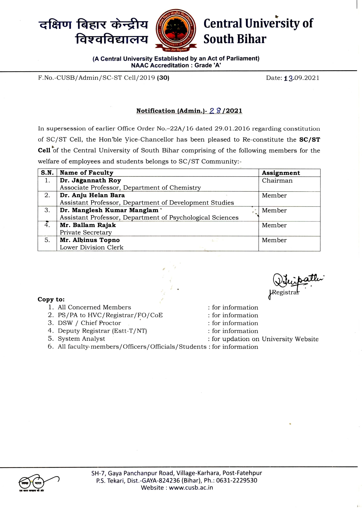 Activities : The SC/ST Cell coordinator and the university authorities organizes periodical meetings with the students and faculty members to solve and resolve issues, if any. The cell coordinator ensures that scholarship of the students are facilitated smoothly by the university authorities. The cell coordinator is involved in matters related to employment of both teaching and non-teaching staffs, reservation roster, and admission of students.