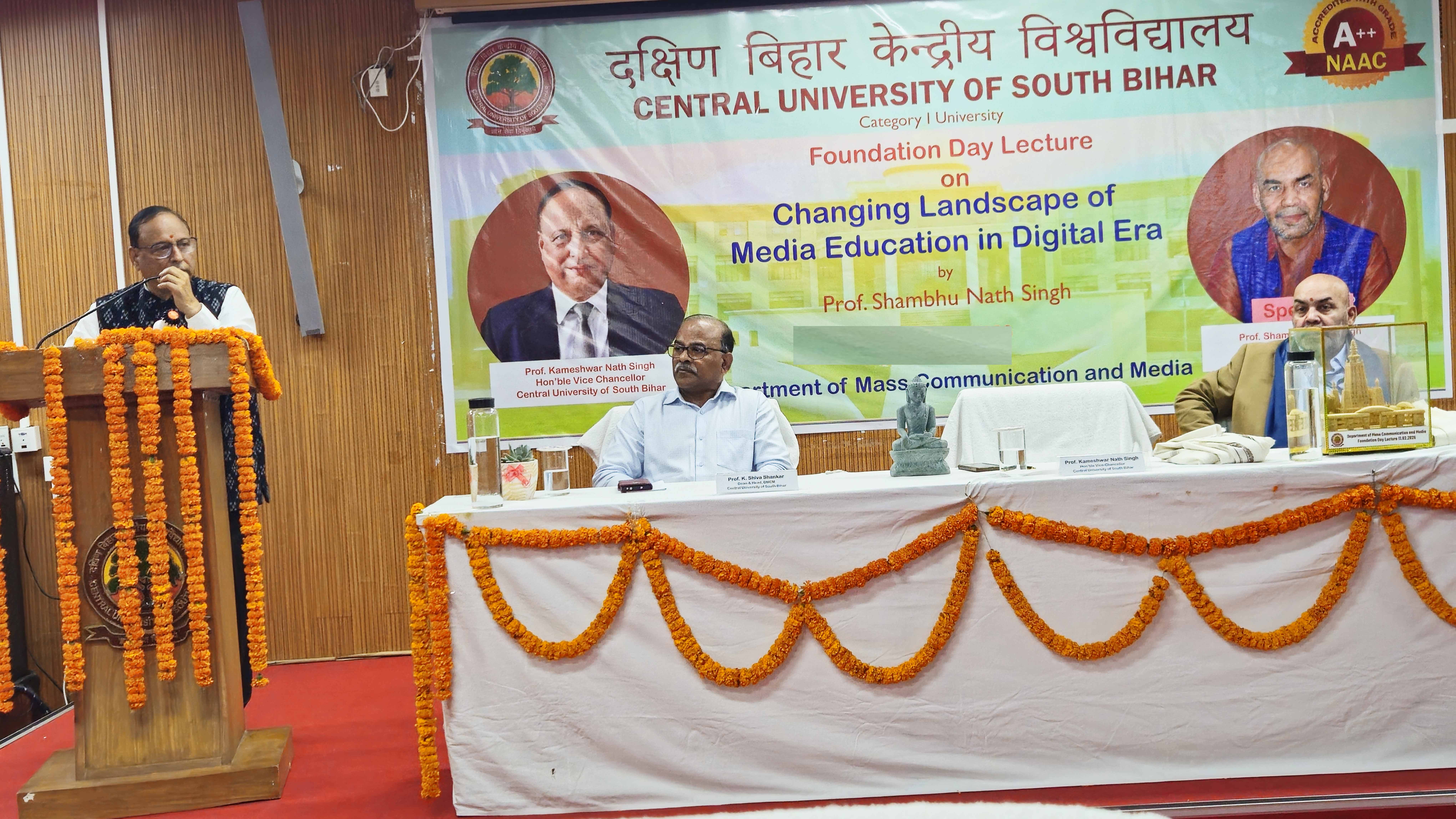 To commemorate the foundation day of the Central University of South Bihar (CUSB), various departments of the University are organizing a series of special lectures, initiated by Vice Chancellor Prof. Kameshwar Nath Singh. In this series, the Department of Mass Communication and Media organized a special lecture on ‘The Changing Landscape of Media Education in the Digital Age,’ with Prof. Shambhu Nath Singh, Vice Chancellor of Tezpur University, Assam, as the keynote speaker. As a renowned academician and prominent figure in the media world, Prof. Shambhu Nath Singh emphasized the importance of forward-looking education in the field of media. He stated that media education is extremely relevant today. Society cannot exist without communication. Therefore, it is essential to understand communication models. Emphasizing the need for research in media education, Prof. Singh said that research gives rise to new ideas. Prof. Singh said that in today's digital age, where digital technology, social media, and artificial intelligence are rapidly changing the face of media, providing students with a future-oriented and practical education is essential. New media has become the fastest medium. We can transmit information from one part of the world to another in a matter of seconds. He emphasized that journalists' responsibilities have increased today. They must present credible and authentic content, while raising awareness. Misinformation can spread violence and hatred in society. He urged journalism students to be responsible and accountable. Prof. Singh said that the world is full of information today. Everyone should act as a filter, verifying information before accepting and transmitting it. He cited McLuhan's communication model and described it as relevant to the teaching process. He said that a good teacher also learns from their students and improves themselves.