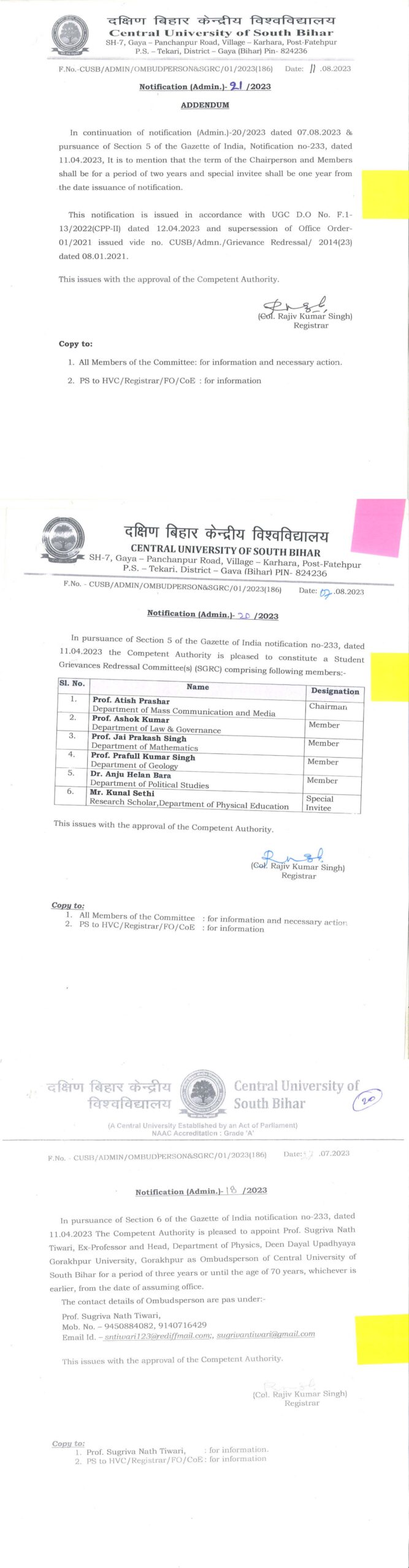 - He will take decisions on grievances which are pending for more than three months. Aggrieved parties who are not satisfied with redressal in subordinate/attached formation can approach the Vice-Chancellor for a decision.