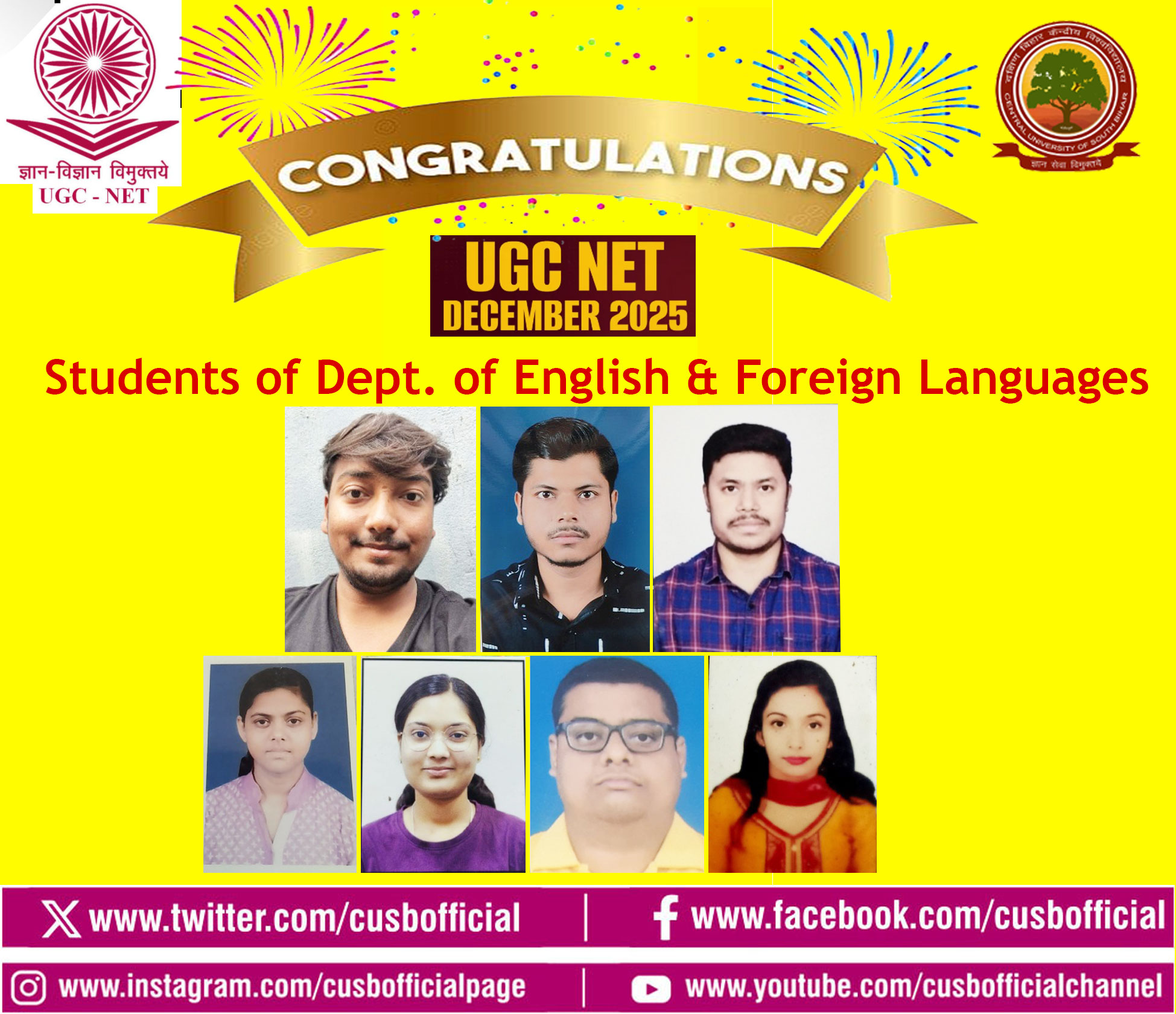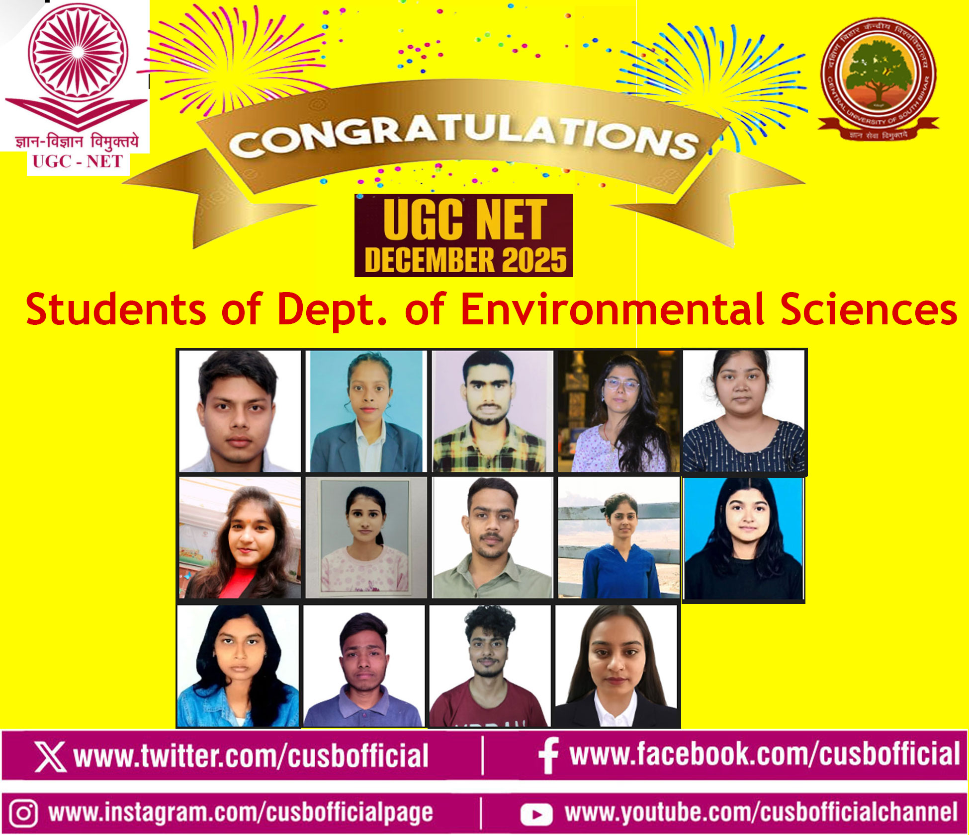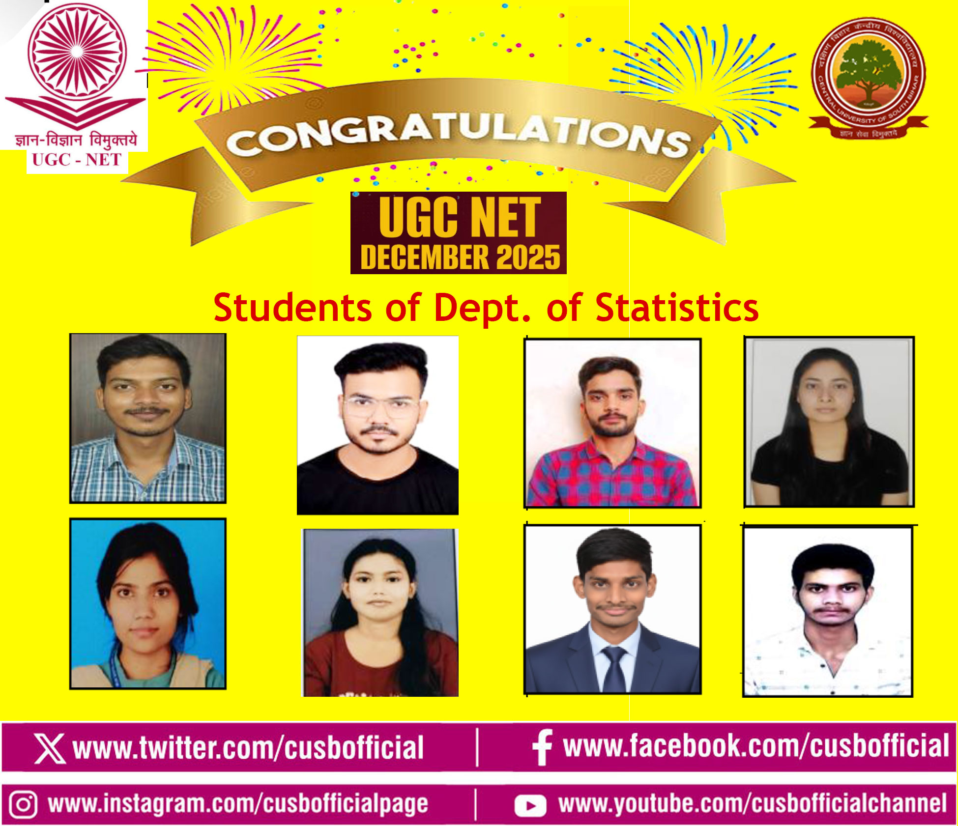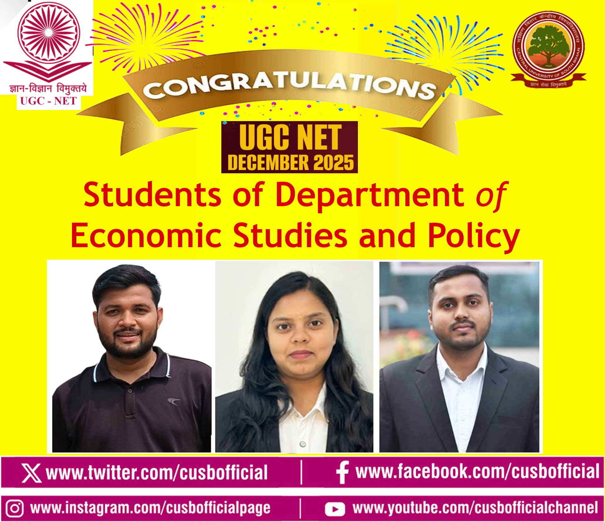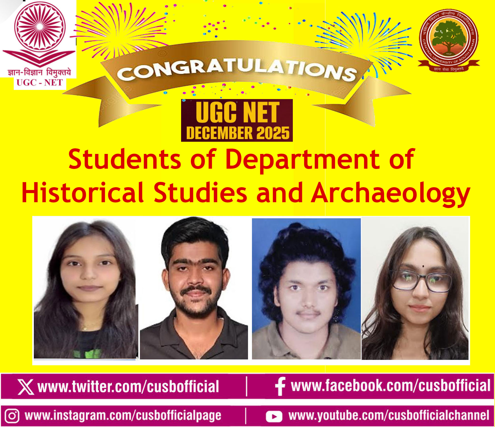 Students from various departments of the Central University of South Bihar (CUSB) have achieved remarkable success in the UGC NET-JRF December 2025 examination, conducted by the National Testing Agency (NTA). Vice-Chancellor Prof. Kameshwar Nath Singh, along with Registrar Prof. Narendra Kumar Rana, Deans of various schools, Heads of Departments, and faculty members, have extended their congratulations and best wishes to the CUSB students on their success in this national-level eligibility test.